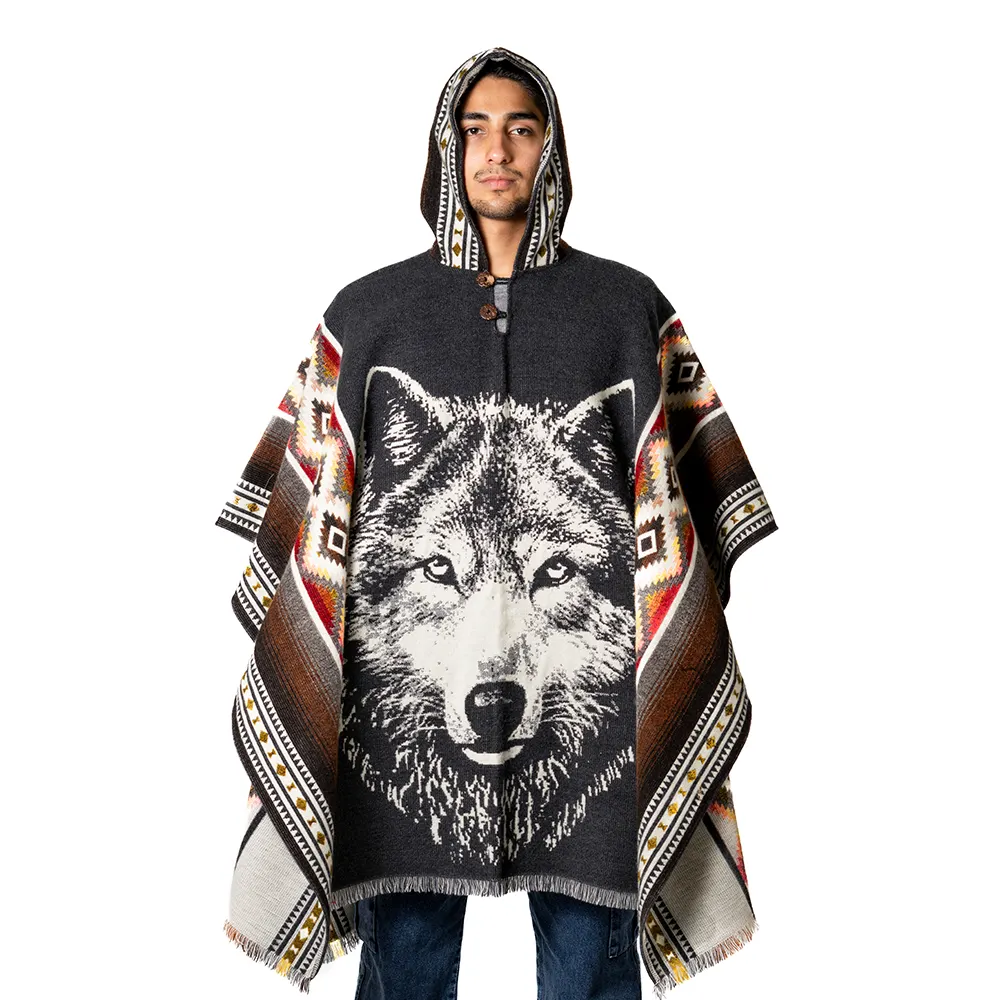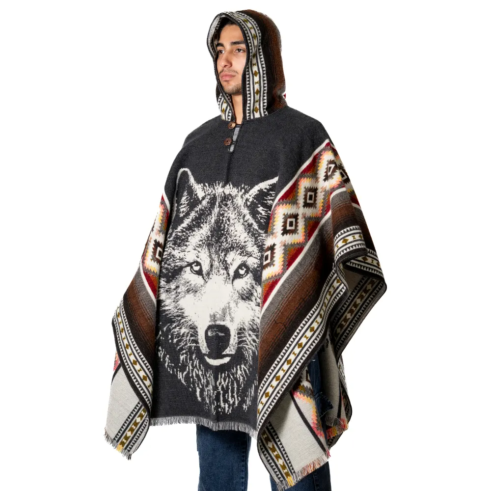 Handmade by indigenous artisans in Ecuador, this Andean Wolf Poncho Hoodie is a unique unisex garment that blends tradition with modern boho festival fashion. Crafted from a warm alpaca wool blend, it is lightweight, soft, and durable, making it perfect for festivals, casual wear, or cold weather.