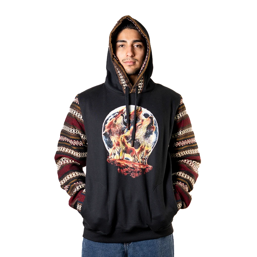Each hoodie features tribal geometric sleeves and a customizable front logo. By default, it includes animal and cultural designs such as wolves, bears, owls, native chiefs, or Andean symbols. If you prefer, we can also create personalized logos according to your request (more details provided internally). This flexibility makes every piece truly unique for your customers.