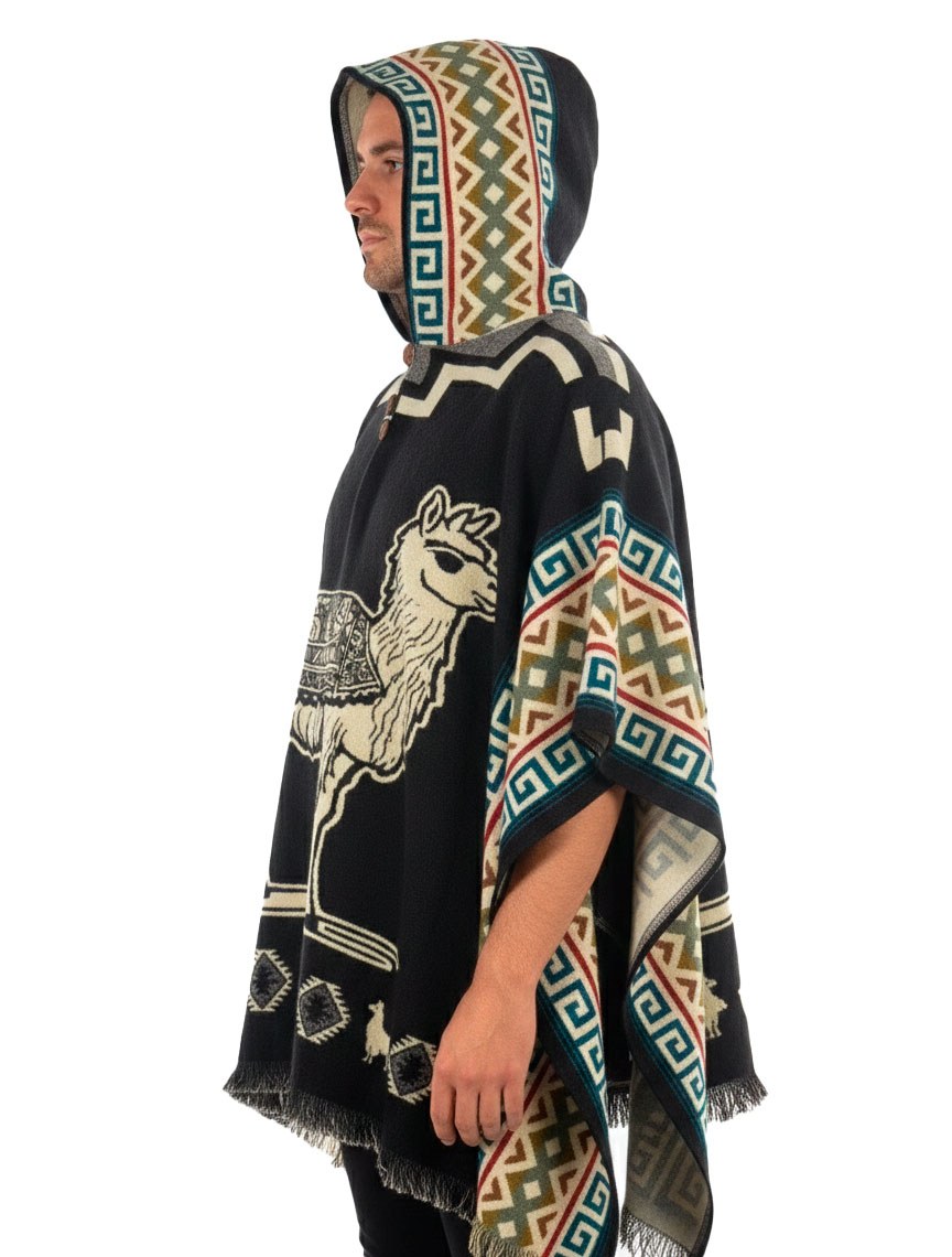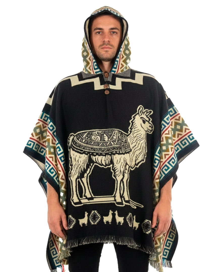 Elaborado a mano por artesanos indígenas del Ecuador, este Poncho Andino de Alpaca con Capucha resalta la esencia cultural de los Andes con un elegante diseño de llama, símbolo de tradición, trabajo y herencia ancestral.