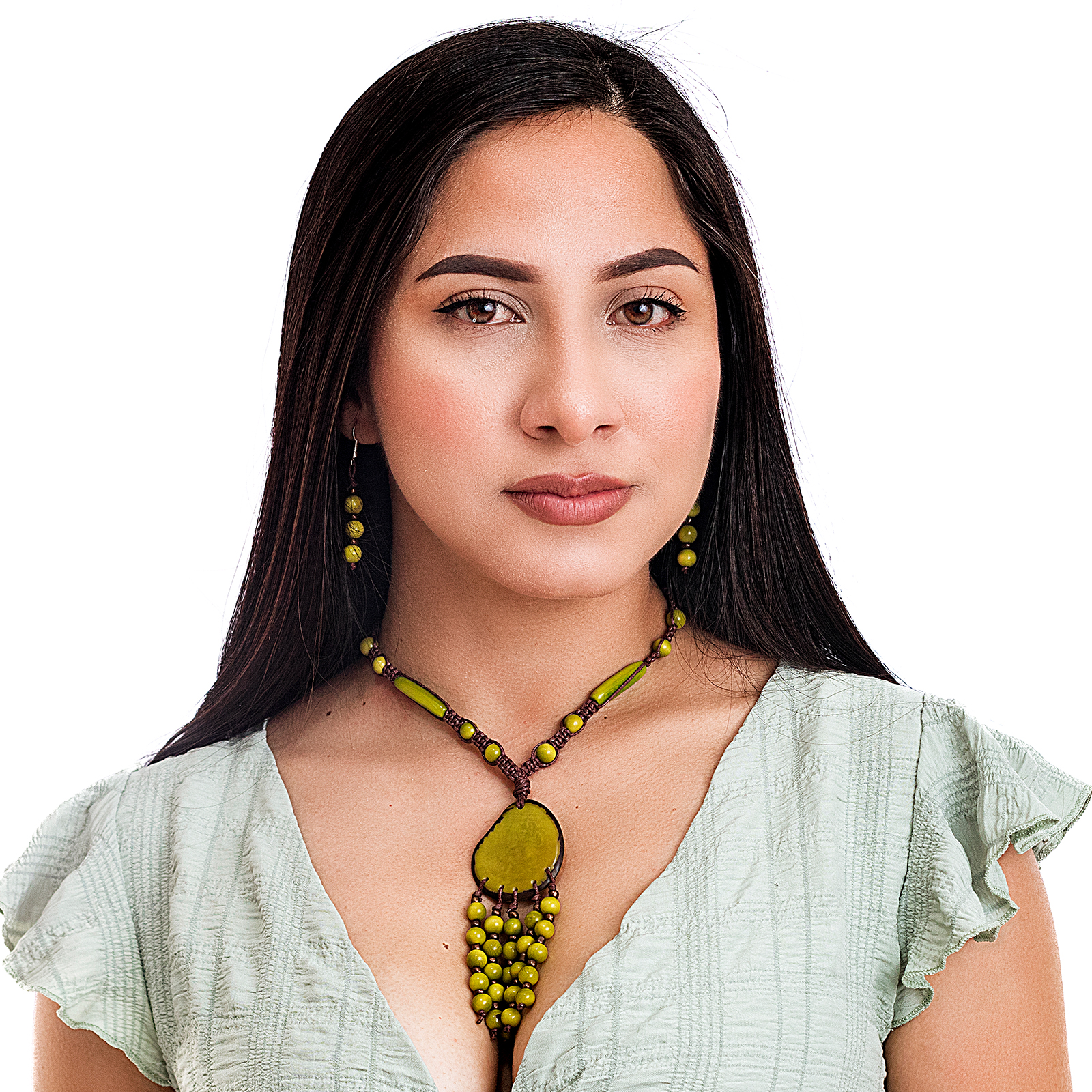 Este llamativo diseño en tono verde oliva presenta un colgante central pulido, complementado con cuentas y detalles naturales en tonos a juego. Ligero, biodegradable y completamente vegano, es el accesorio perfecto para clientes que aprecian la moda consciente con raíces culturales.