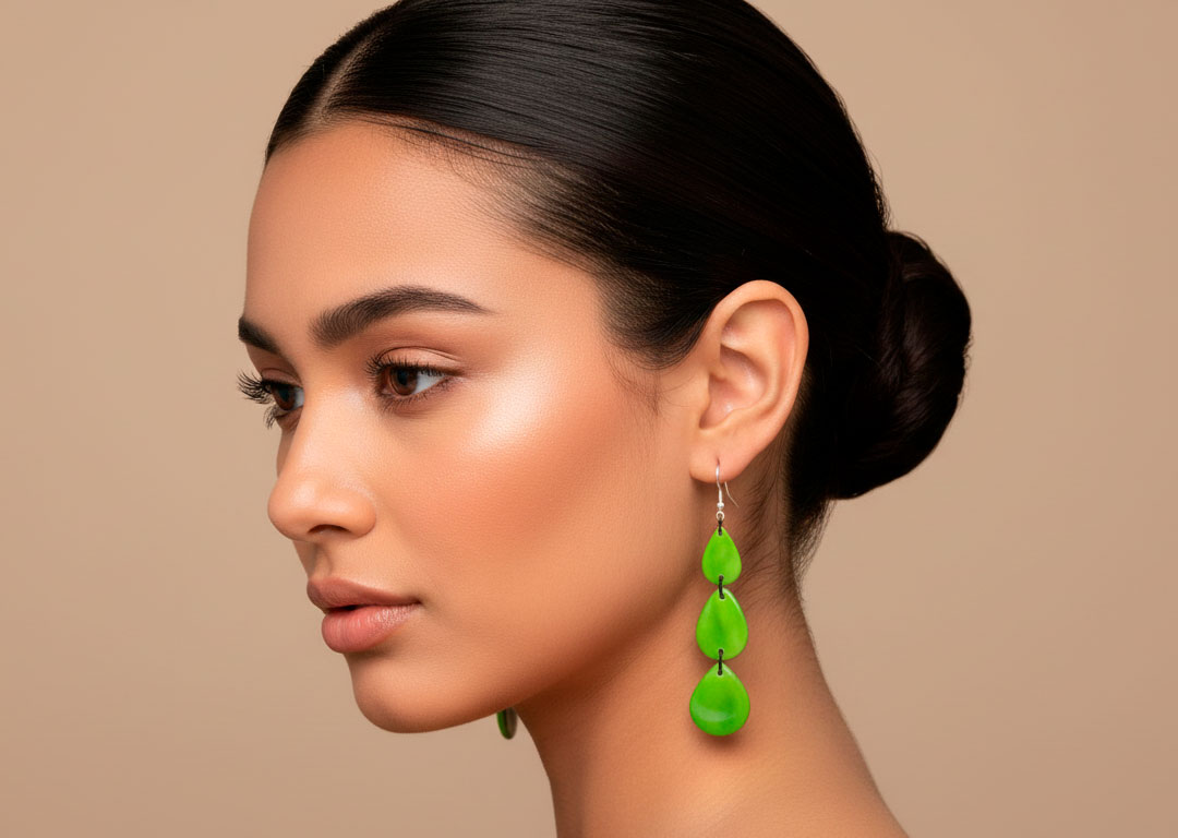 Tagua Long Earrings Wholesale, Add a touch of natural elegance to your accessories collection with our Handcrafted Long Tagua Drop Earrings, skillfully made in Ecuador from 100% natural tagua nuts, also known as vegetable ivory. These lightweight, vegan earrings feature three polished tagua drops connected vertically, available in assorted vibrant and earthy tones not just the green shown making each pair unique and eye-catching.