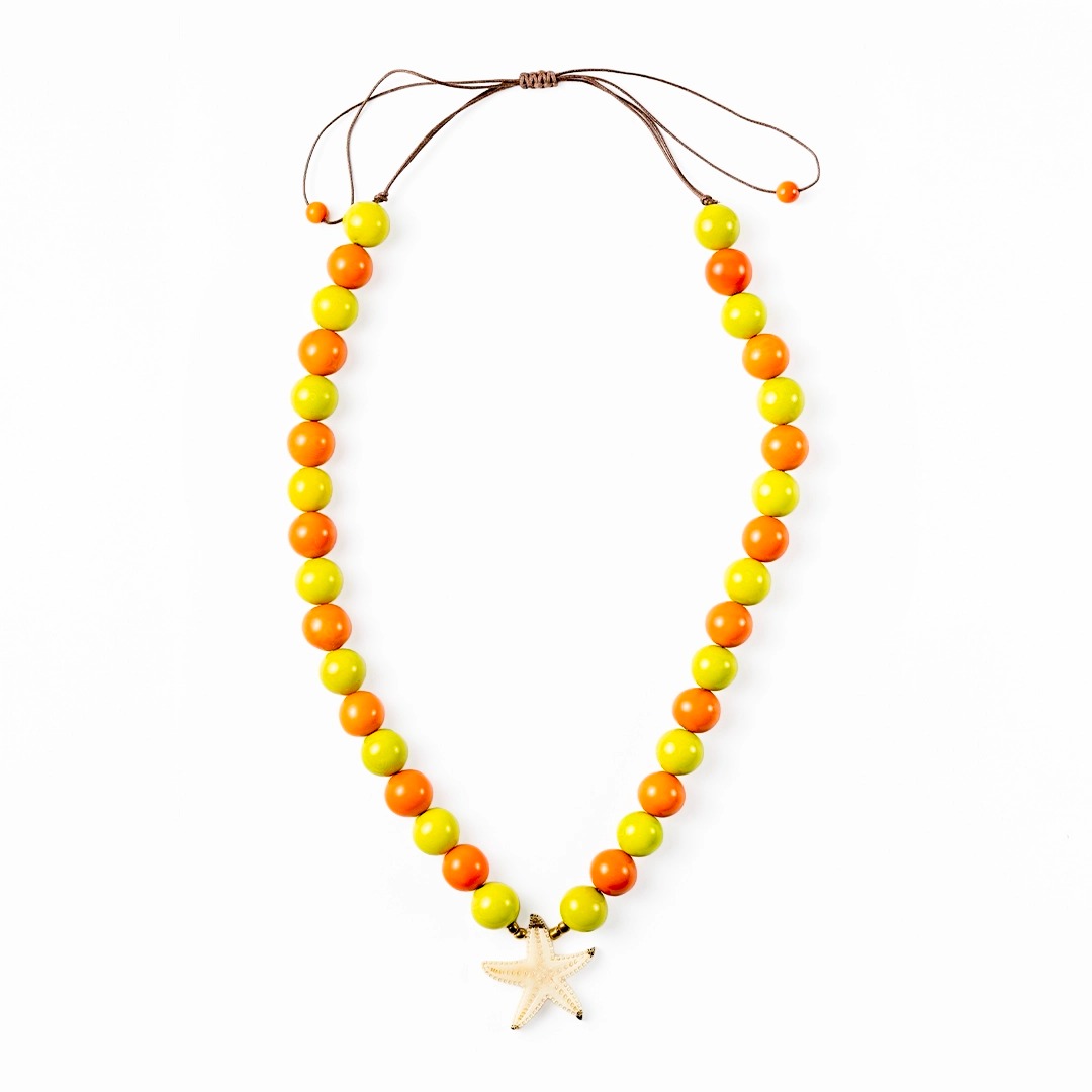 Handcrafted Tagua Necklace Natural Seed Pendant Wholesale, Bring coastal charm and tropical color to your boutique with our Tagua Starfish Summer Necklace, handcrafted in Ecuador using 100% natural tagua nuts. This vibrant necklace features polished tagua spikes in assorted bright hues, centered around a charming starfish pendant that captures the carefree essence of summer.