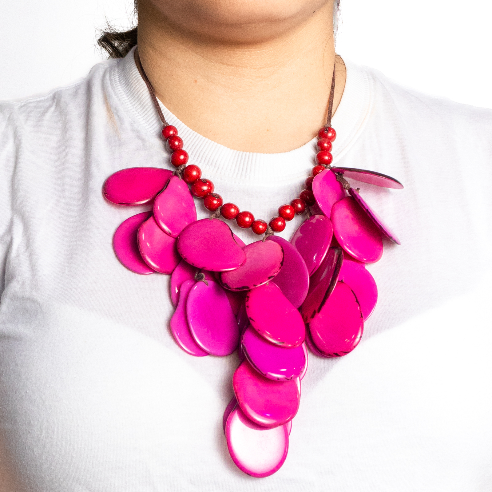 Layered Tagua Petal Necklace Bold Handmade Eco Jewelry Wholesale, Bring bold, sustainable beauty to your boutique with our Layered Tagua Petal Necklace, handmade in Ecuador from 100% natural tagua nuts an eco-friendly, plant based alternative to ivory. This striking necklace features overlapping tagua slices in petal-like shapes, creating a cascading, sculptural effect full of movement and style.