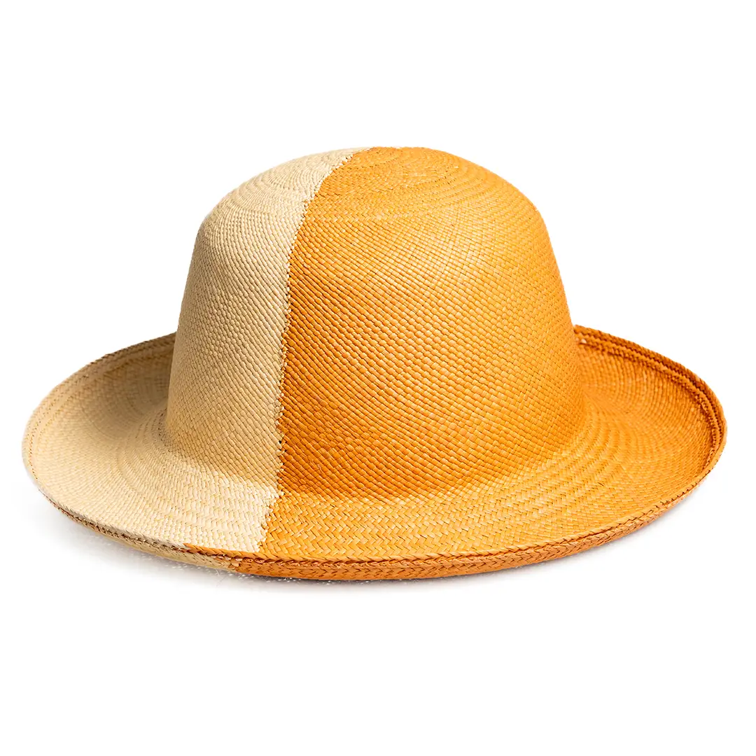 Semi-finished Panama hat handwoven in Ecuador using authentic toquilla straw in a breathable brisa weave, known for its lightweight and ventilated structure. This two-tone model combines vibrant fiber and is delivered unblocked, ready for professional pressing and shaping in factories or workshops into styles such as Fedora, Optimo, Classic, or Gambler.