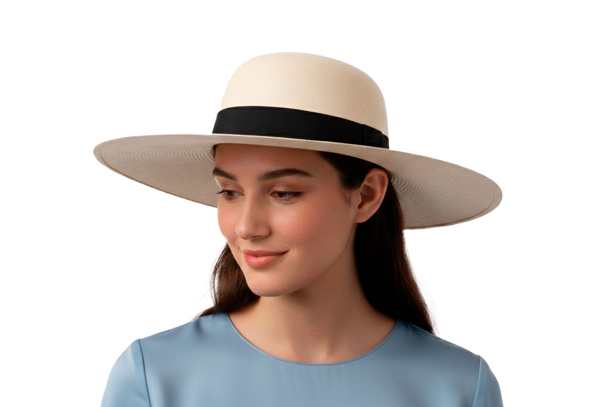 Panama Hat Toquilla Straw Wide Brim Natural Coco Pavita Women Wholesale , Handwoven in Ecuador by skilled artisans, this Coco Pavita style Panama hat is made from 100% natural toquilla straw, recognized by UNESCO as an Intangible Cultural Heritage. Its wide brim offers maximum sun protection, making it perfect for outdoor activities, events, and summer fashion. With export quality weaving, durable finish, and elegant white color with black ribbon, this unisex design combines elegance and functionality. Available in bulk orders at competitive prices, it is an excellent choice for boutiques, resort shops, distributors, and online retailers, while guaranteeing authentic craftsmanship direct from Montecristi and Cuenca artisans.”